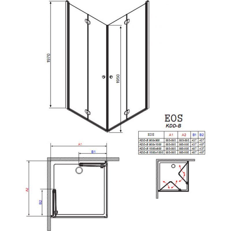 Eos KDD B – душевой угол со складывающимися дверями. Дверь складывается по середине внутрь душевой зоны, стекло ближе стены поворачивается внутрь и наружу.