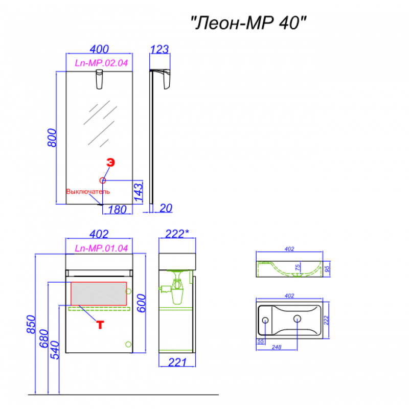 Комплект подвесной тумбы Aqwella Leon 40x22 см, белый с умывальником UNAM, Ln-MP.01.04/W+T1.04.04D