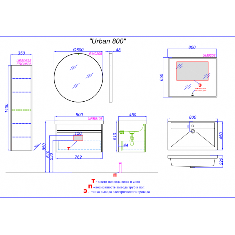 Комплект подвесной тумбы Aqwella Urban 82x46 см, белый с умывальником Фостер 82, URB0108W+4640021064733