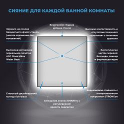 Функция плавного диммирования позволяет регулировать интенсивность свечения, а контроллер запоминает последнее положение яркости. При легком касании сенсора подсветка включается и выключается, а при длительном нажатии изменяется яркость свечения. За счет тонкой рамы зеркало идеально прилегает к стене и сливается с ее поверхностью, а светодиоды сбоку практически не видны. Заводские металлические крепления надежно удерживают всю конструкцию, а монтажные работы можно выполнить самостоятельно, не прибегая к помощи профессионалов.