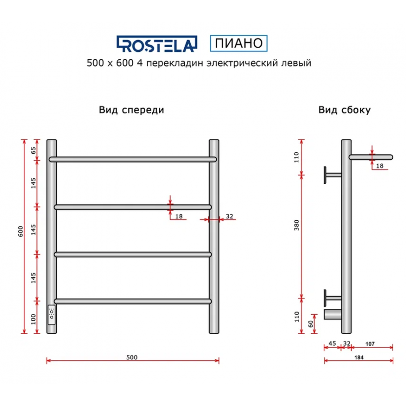 Полотенцесушитель электрический Пиано 500х600/4 (диммер, левый) хром