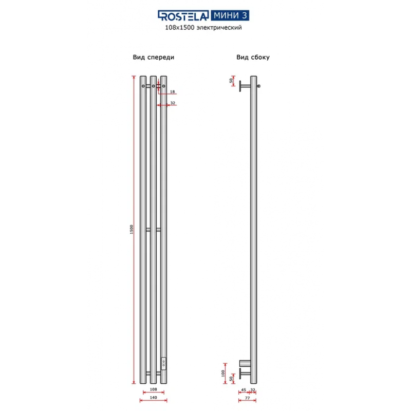 Полотенцесушитель электрический Ростела Мини 3 108х1500/3 (Ral 9016, с крючком, диммер)