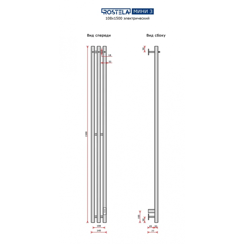 Полотенцесушитель электрический Ростела Мини 3 108x1500/3 (Ral 9005, с крючками, диммер)