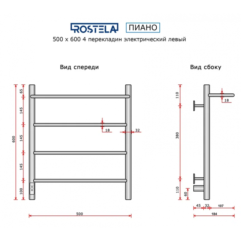 Полотенцесушитель электрический Ростела Пиано 500х600/4 (диммер, левый) Ral 9005