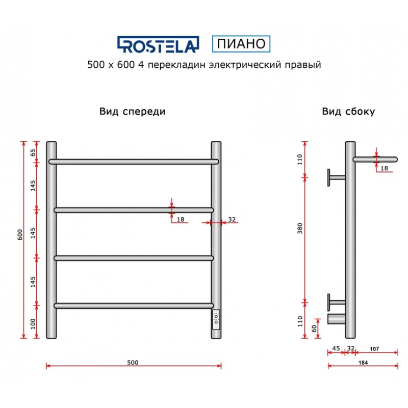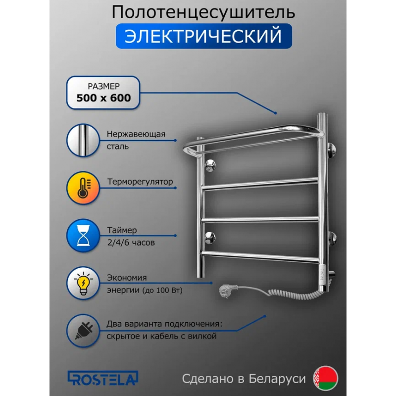 Полотенцесушитель электрический Ростела Пиано 500х600/4 (диммер, правый) хром