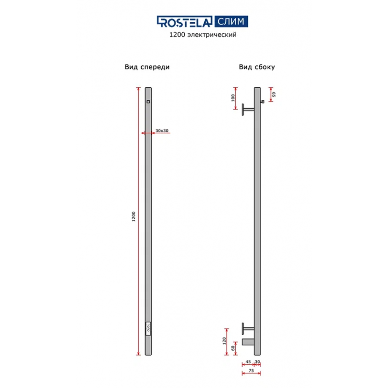 Полотенцесушитель электрический Ростела Слим 1 1200/1 (Ral 9005, с крючком, диммер)