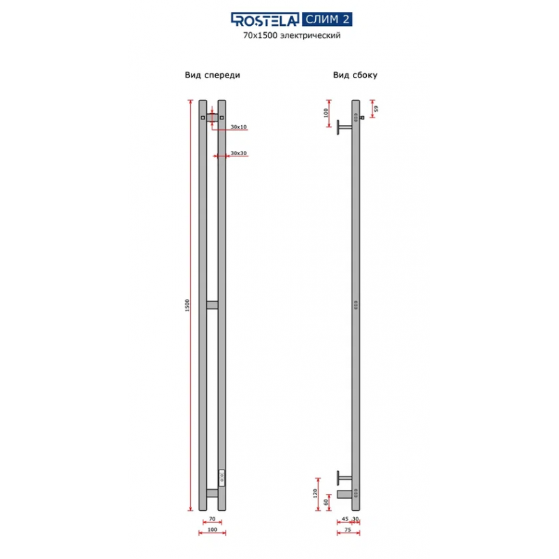 Полотенцесушитель электрический Ростела Слим 2 70х1500/2 с крючками (диммер) хром
