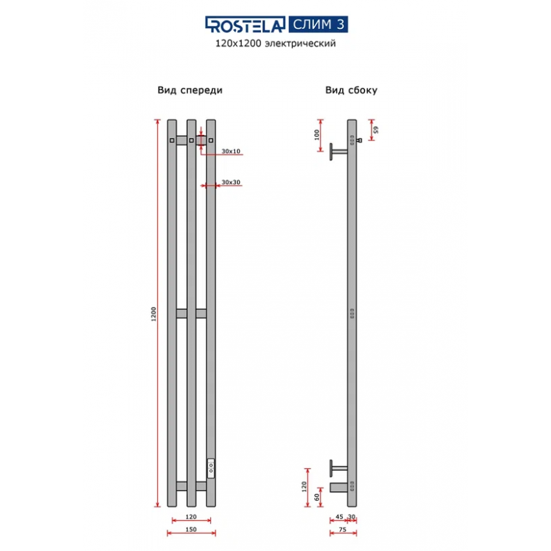 Полотенцесушитель электрический Ростела Слим 3 120х1200/3 (Ral 9005, с крючком, диммер)