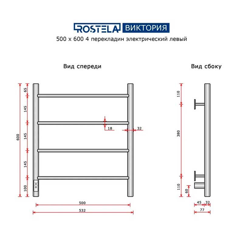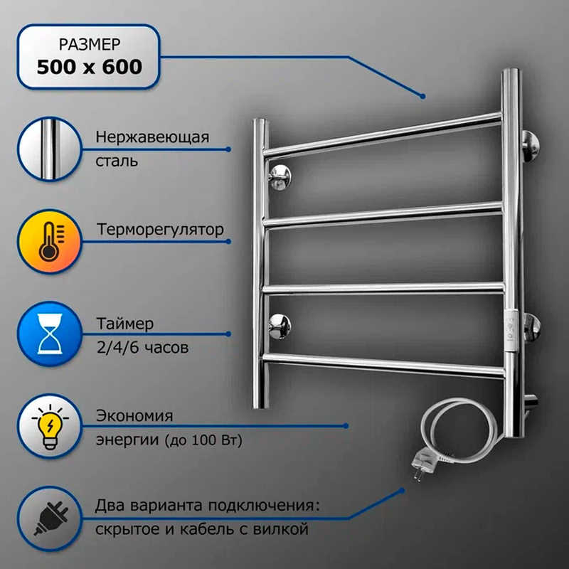 Полотенцесушитель электрический Виктория 500х600/4 (диммер, левый) хром