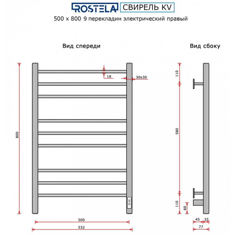 Полотенцесушитель Ростела Свирель V квадрат 500 х 800/9 (нижн.подв.,1/2") правый