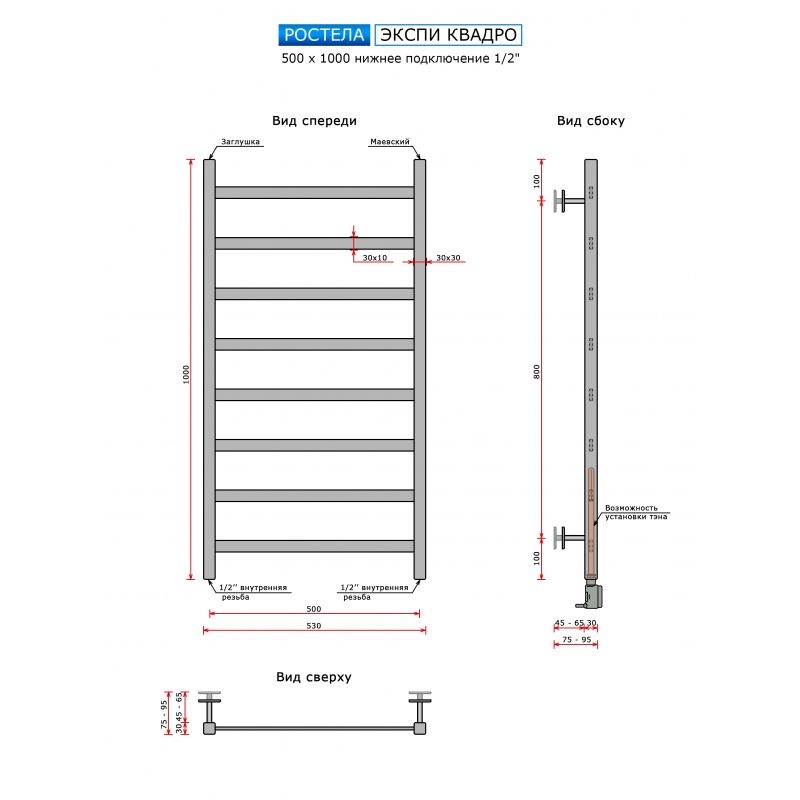 Полотенцесушитель водяной Ростела Экспи Квадро V 30 нижн.подв.1/2" 500х1000/8