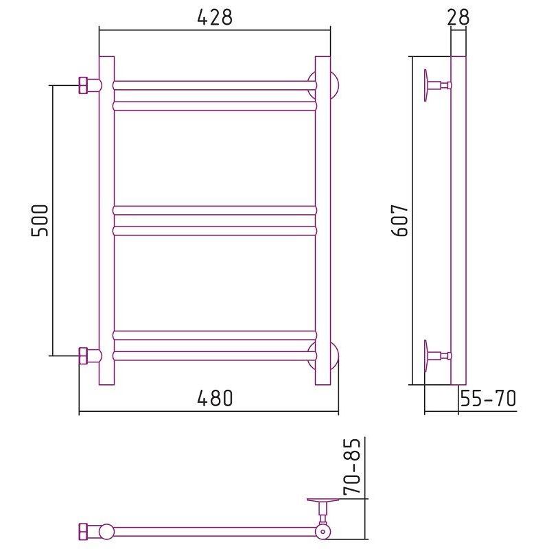 Полотенцесушитель водяной Стилье Версия-Б1 00611-5040, 3/4 дюйма накидные гайки, высота 50 см x ширина 40 см, боковое подключение 50 см, хром