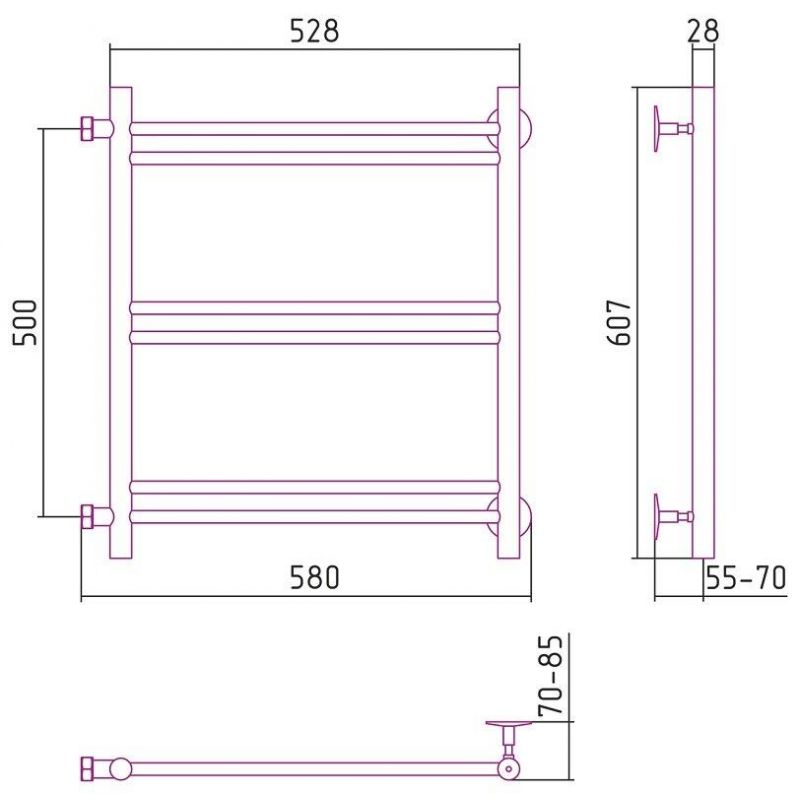Полотенцесушитель водяной Стилье Версия-Б1 00611-5050, 3/4 дюйма накидные гайки, высота 50 см x ширина 50 см, боковое подключение 60 см, хром