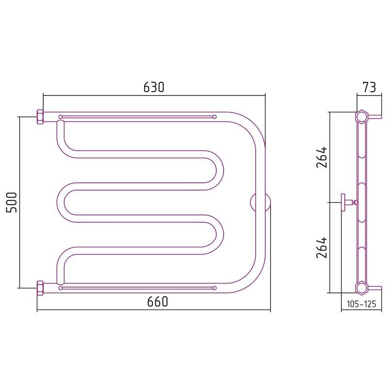 Полотенцесушитель водяной Сунержа Лира+, ширина 65 см, высота 50 см, боковое подключение 50 см, 2 полки, цвет хром, 00-4012-5065