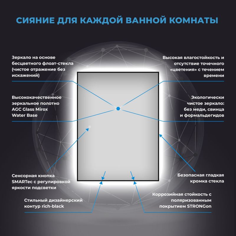 Безупречное японское стекло — результат непрерывного развития технологий, оно соответствует единой системе защиты от коррозии и точечного «цветения» с течением времени. Периметр зеркального полотна декорирован тонким черным контуром, при облучении которого отверждаемые УФ-чернила значительно повышают прочность сцепления.
