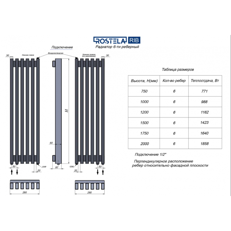 Радиатор Ростела Rib 6 / 280х2000 черный муар 9005