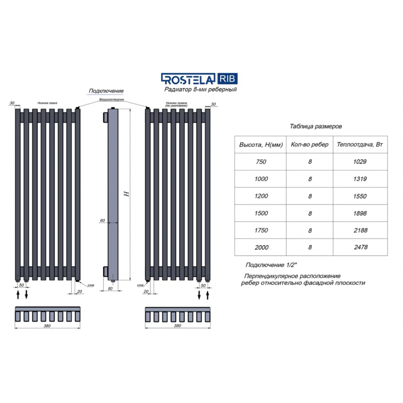 Радиатор Ростела Rib 8 / 380х1500 черный муар 9005