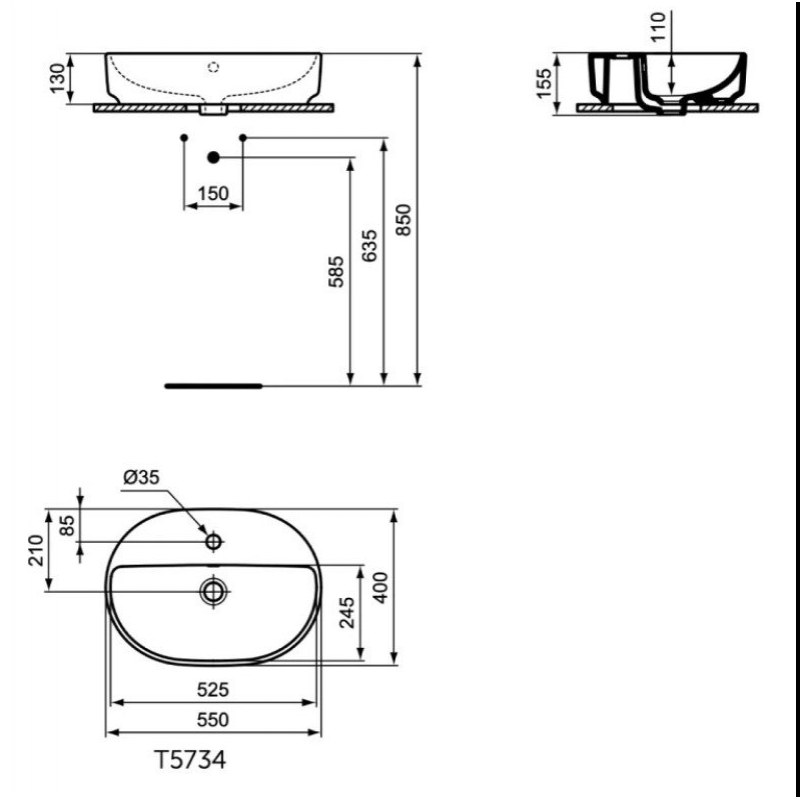 Раковина-чаша овальная 55х36 см, Ideal Standart I.LIFE O, 1 отверстие под смеситель, с отверстием перелива, без крепежа, T573401