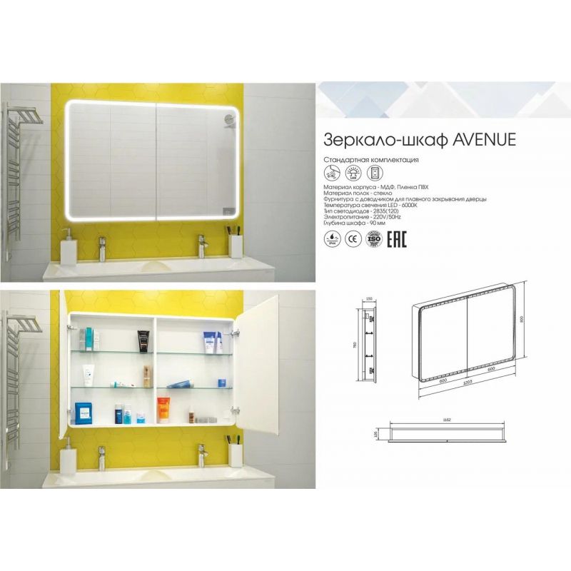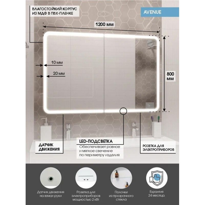 Шкаф с зеркалом Континент Avenue Led 120x80 с подсветкой, датчиком движения и розеткой