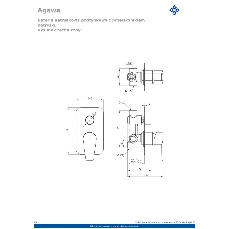 Смеситель для душа скрытого монтажа Deante Agawa BQG_045P хром