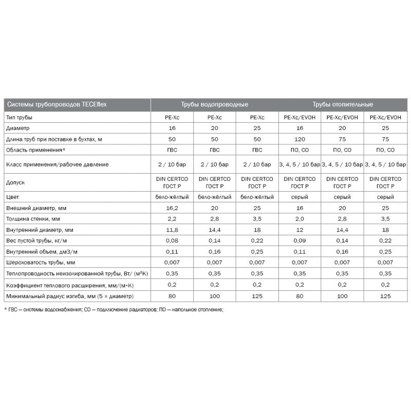Применение трубы PE-Xc предусмотрено при невысокой температуре теплоносителя (не более 40 ºС) для давления до 20 бар, что подходит для её использования в многоэтажных домах и квартирных распределителях для скрытой и открытой разводки, настенного монтажа, установки в шахтах и канала