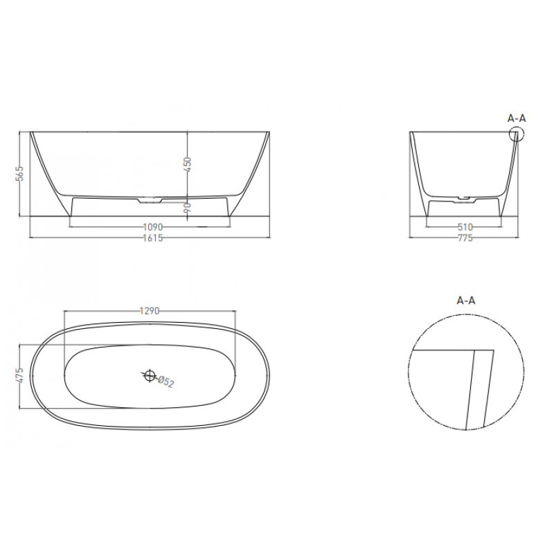 Ванна каменная UMY NOA LIGHT 162x77 U-Solid, без перелива, цвет белый матовый