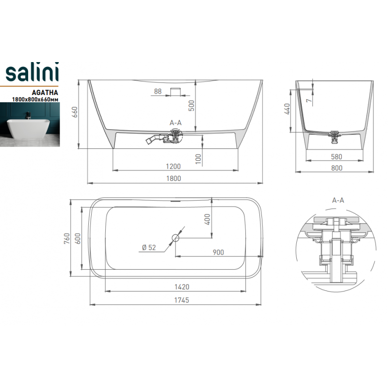 Ванна отдельностоящая Salini AGATHA 180x81 (S-Stone, матовый)