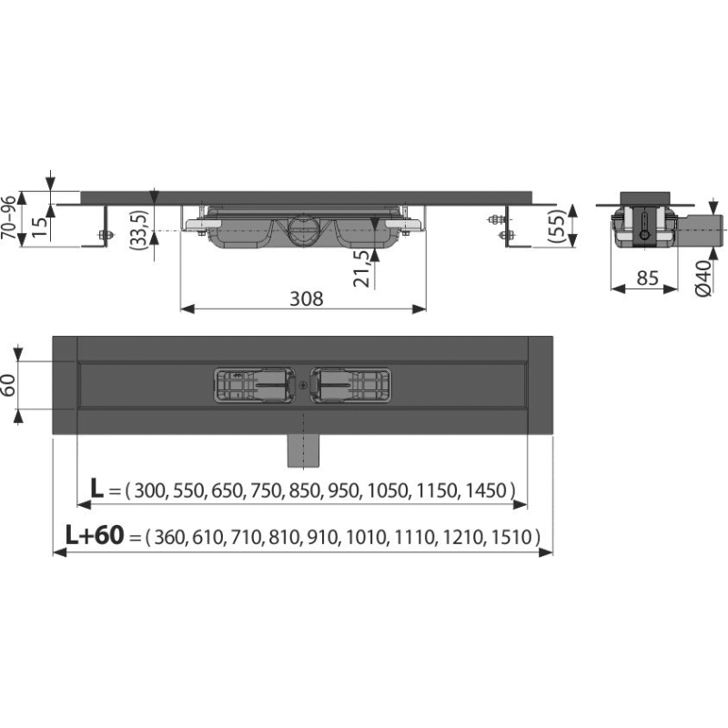 Водоотводящий желоб Alcaplast APZ101BLACK-300 низкий с порогами для перфорированной решетки, черный-мат